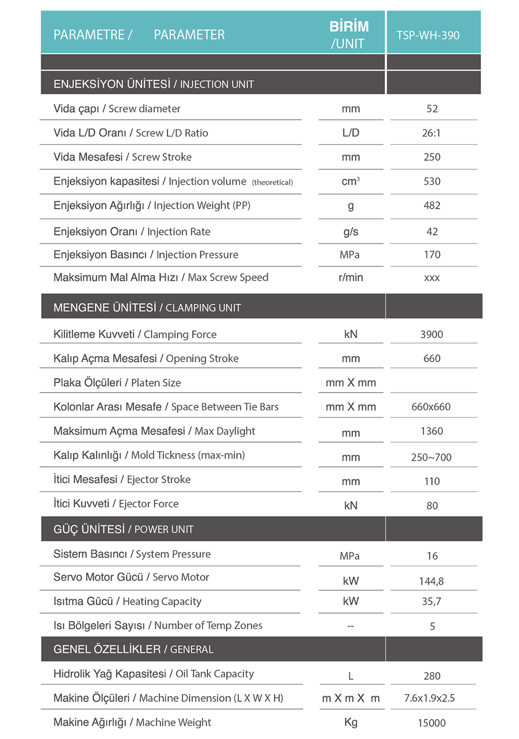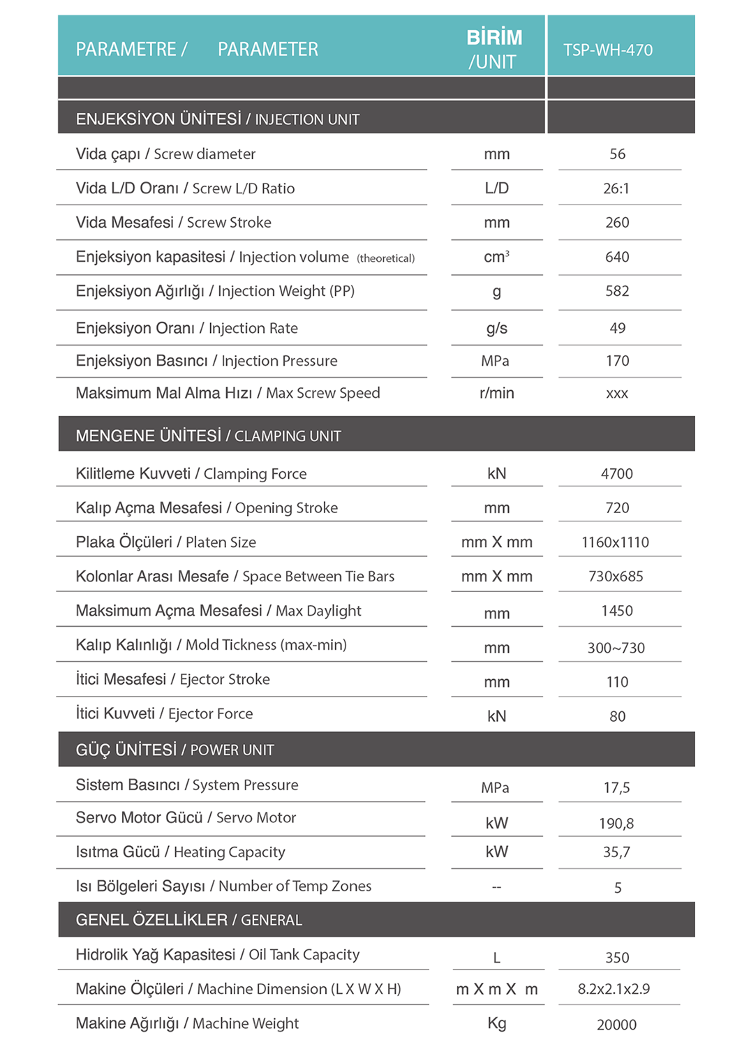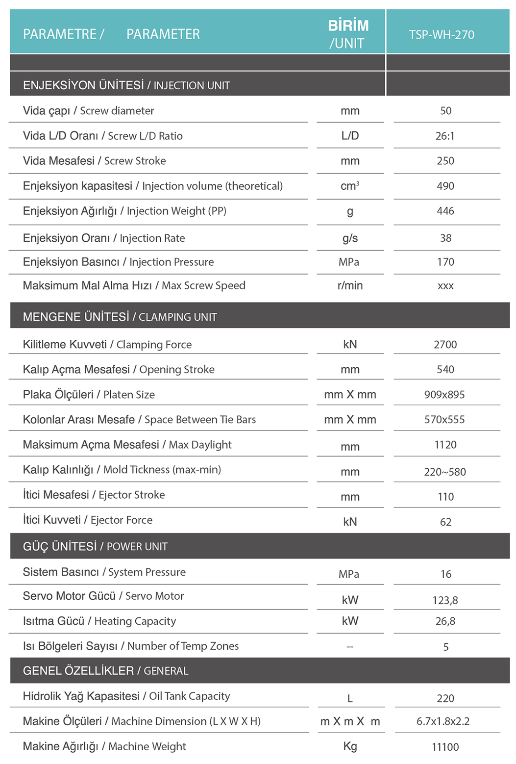 TSP/WGS hybrid high speed injection machine is a special machine produced for thin-walled products. TSP/WGS hybrid high speed injection machine moves with a servo motor driven belt-pulley system and provides a faster and more stable injection with ballscrew (worm screw shaft). The special machine produced for TSP/GSD series hybrid high-speed and thin products adopts injection unit, ball screw belt pulley servo motor drive and Linear slide rail support. Injection response time is faster, injection repetition accuracy is higher, injection accuracy can be reached 0.02.